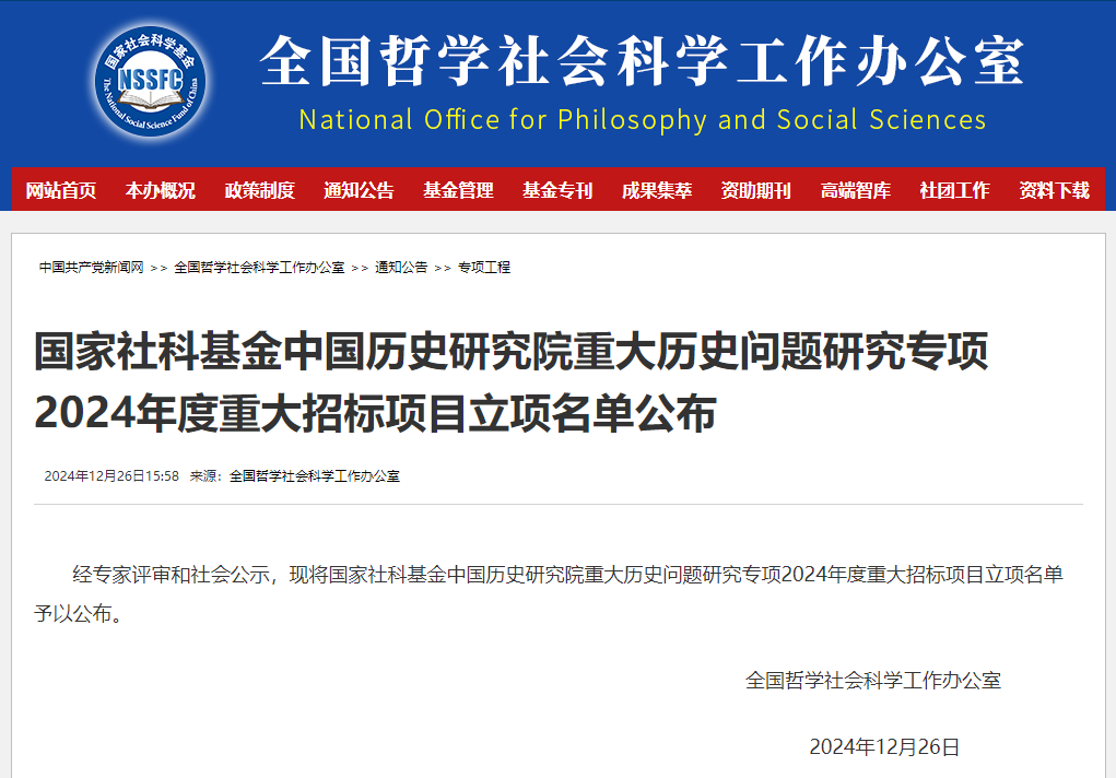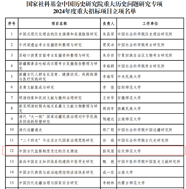 12月26日,全国哲学社会科学工作办公室公布《国家社科基金中国历史研究院重大历史问题研究专项2024年度重大招标项目立项名单》。公司彭凤莲教授担任首席专家的“中国古代监察制度变迁的历史源流”项目获批立项。这是公司首次获得国家社科基金中国历史研究院重大历史问题研究专项重大招标项目,也是公司国家社科基金重大项目的历史性突破。