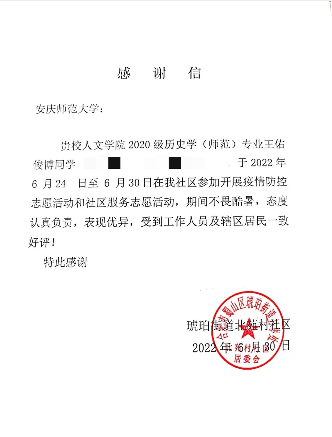 近日,SUNBET申博收到合肥市蜀山区琥珀街道北苑村社区的感谢信。信中对SUNBET申博2020级历史学专业王佑俊博同学暑期疫情防控志愿服务活动予以高度评价。