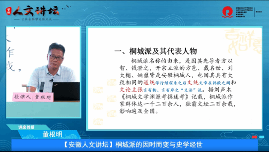 安徽组织干部公司(安徽干部网络公司)主要负责组织、管理、实施全省干部网络培训及组工干部培训工作。此次董根明教授讲座视频入选省干公司线上课程后,一经上线便受到在线学员们的热切关注。在最近来皖考察交流的新疆社会科学届学术骨干的宣讲中,学员们便对董教授的讲座内容产生了浓厚兴趣,并围绕相关问题展开了热烈的研讨。本次讲座兼顾文史知识普及与学术深度研究成果分享,是董根明教授多年皖江历史文化与桐城派学术研究的成果转化,旨在弘扬人文精神,推动文化普及。讲座视频入选相关在线学习平台后,对提升校、院两级在全国文史研究领域的声誉与社会各界的影响力、推介安庆深厚的文化底蕴、打造徽风皖韵的文旅事业具有重要意义。(撰文/图片 郭海涛 审核/王波)