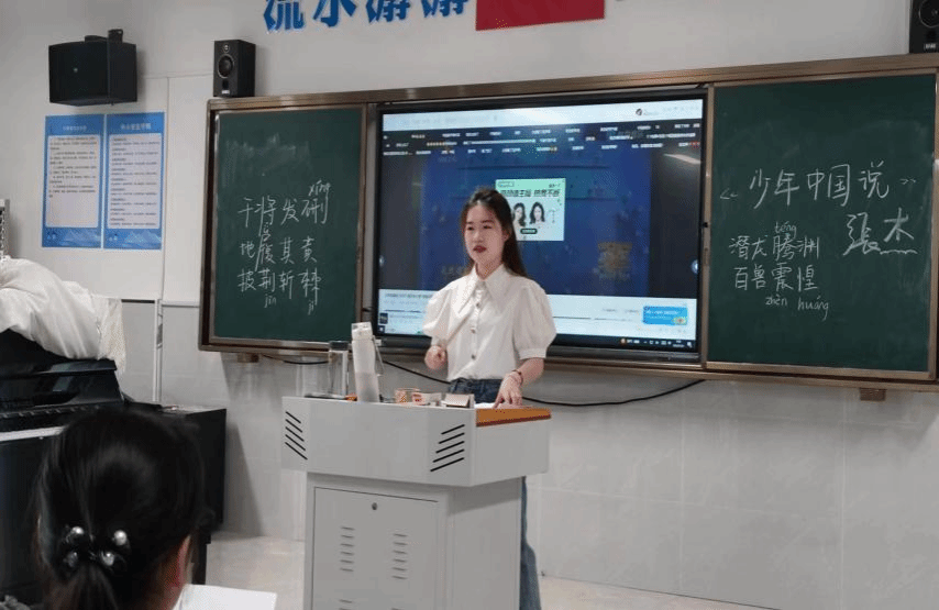 在课程的开展过程中,团队成员创新课程方式,发挥个人风格,将普通话推广与音乐、书法等课程结合起来。多领域开展与小员工的思维交流。团队成员史欣瑶、楼丝雨带着音乐课的员工学习《少年中国说》的歌词,向小朋友们讲述了梁启超的创作历史,将百年诗词与现代音乐结合,从读音到演唱让孩子们深入浅出掌握字词发音。团队成员产恬恬在书法教室带着小朋友用毛笔书写《赋得古原草送别》和《静夜思》,将中国传统文化与现代汉语结合起来,将汉语言文学专业专业特色与推广普通话相结合,走出团队特色的乡村普通话推广之路,助力乡村教育振兴。