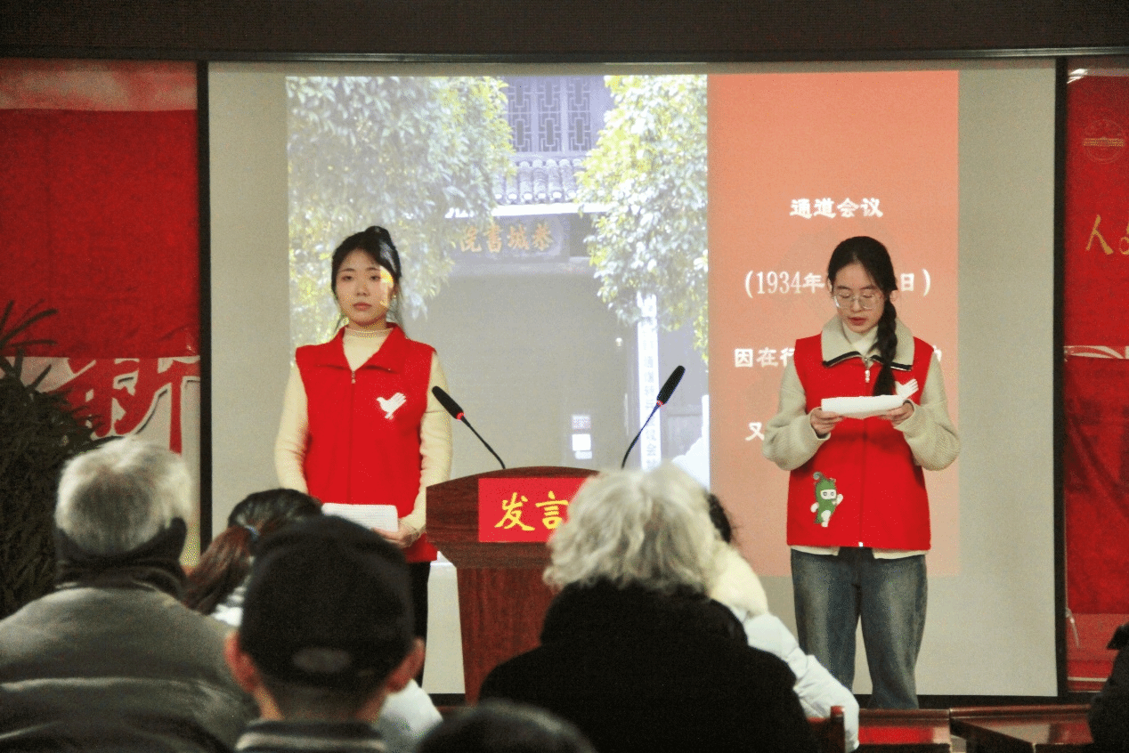 冒着凌冽寒风,宣讲团成员提早许久便来到了社区活动场地,进行设备调试和人员彩排。本次宣讲活动的形式不同往常,采用了“旁白+情景演绎”的方式。一段简短的遵义会议历史背景相关的影视片段拉开了本次宣讲的帷幕。“探忆·燃灯”青年志愿宣讲团成员严格按照党史发展脉络,依次上台向观众生动形象地诉说遵义会议的历史背景以及遵义会议前后发生的一系列惊心动魄的历史故事。整场宣讲通过影视片段呈现、情景再现、人物对话的方式将遵义会议伟大转折的历史意义娓娓道来,弘扬伟大遵义会议精神,具有很强的感染力。社区负责人表示:“社区许多老党员对遵义会议的故事烂熟于心,他们听说我们这次宣讲活动中有情景演绎的环节,都非常期待我们当代老员工这次形式新颖的宣讲。”