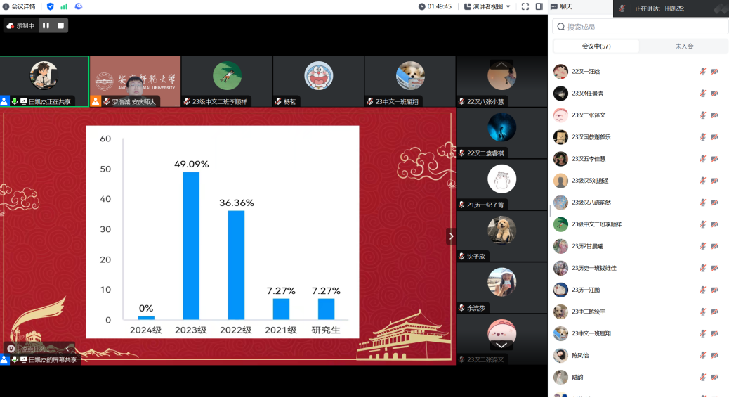 “从数据走来”,田凯杰发放问卷提前收集了人文青马班学员的年级分布、专业分布、毕业方向、政治面貌与个人职务五大方面的数据,重点介绍了考公、考研与考教师编三方面的具体内容,结合自身经历经验分别给出了建设性建议与应对性策略。“从自身实际出发,关注时政局势变化”“拒绝临时抱佛脚,尽早进行规划”“学会解构各类考试,有意练习各类‘商’”……就员工的日常学习与工作而言,田凯杰分享的经验和建议为员工的规划指明方向。
