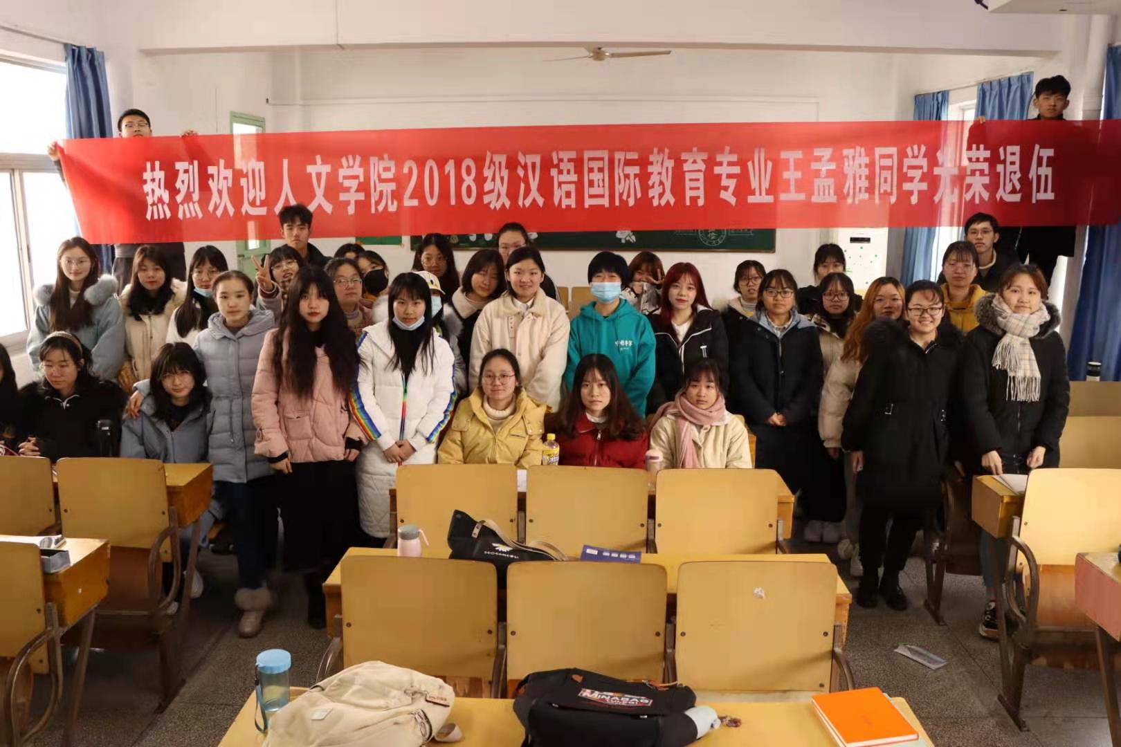 “热烈欢迎2018级汉语国际教育专业王梦雅同学光荣退伍!”1月6日上午,在菱湖校区教学楼310教室,汉语国际教育专业2018级的员工们举办了一场特殊的欢迎会,欢迎刚从南海舰队退伍的王梦雅同学。