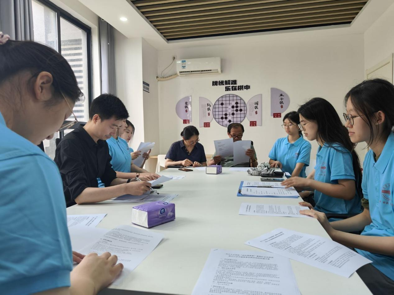 在实践活动对接会上,实践团师生与山口乡文化站站长朱燕,山口乡老年大学董事长、《古皖风韵》主编王彰海共同研讨暑期“三下乡”推普实践活动方案。