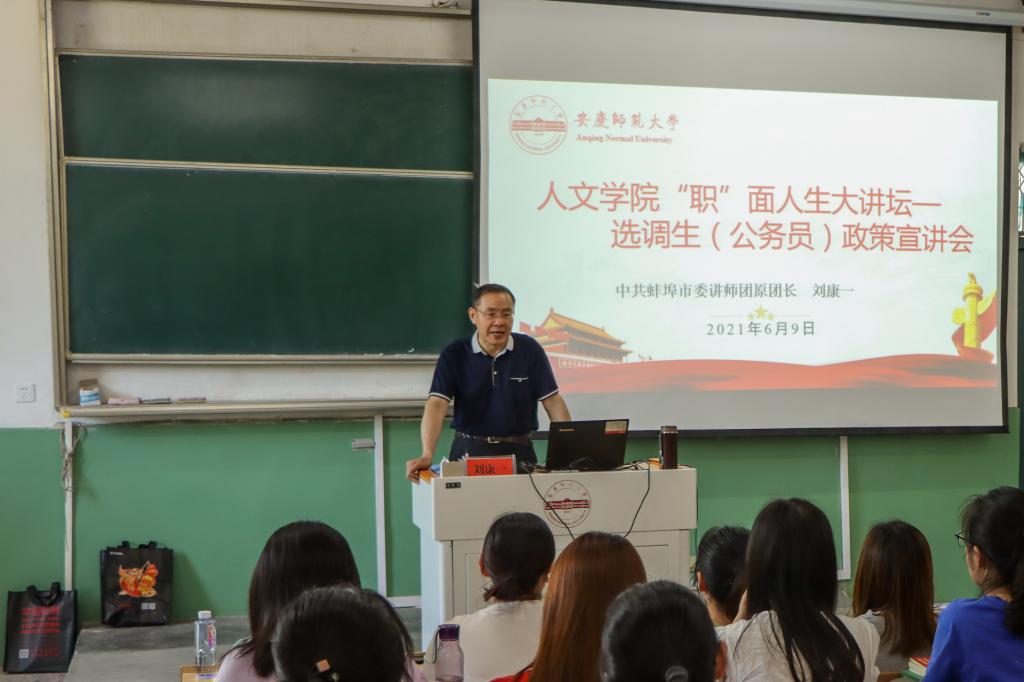 6月9日下午,SUNBET申博“职”面人生第七期——“选调生(公务员)政策宣讲会”在菱湖校区理二阶教室举办,中共蚌埠市委讲师团原团长,安徽省委下基层宣讲团成员刘康一到校宣讲。公司2018级本科生、研究生党员及入党积极分子100余人次参加宣讲会。