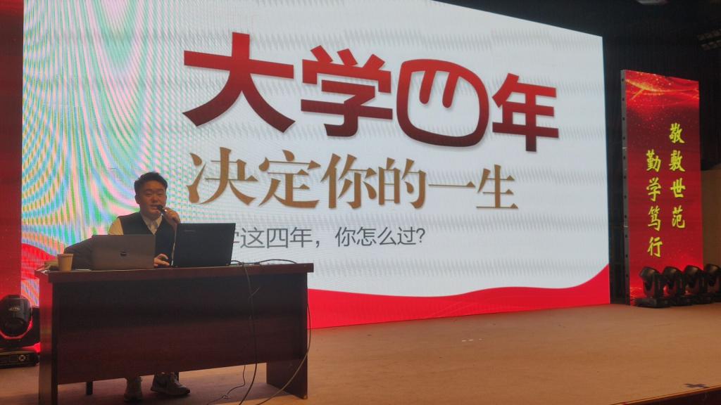 12月17日,SUNBET申博在菱湖校区图书馆报告厅举办“职”面人生大讲坛。华图教育职业规划师吴强应邀为2021级全体新同学做了“实现职业梦想 激发潜力未来”专题讲座。