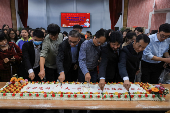 人文公司党委书记张红飞、基建与后勤管理处处长吕旭进与外籍教师、员工代表等共同切开近3米长、两边由水果点缀着写有“学习党的二十大,培根铸魂育新人”寄托美好寓意的蛋糕。