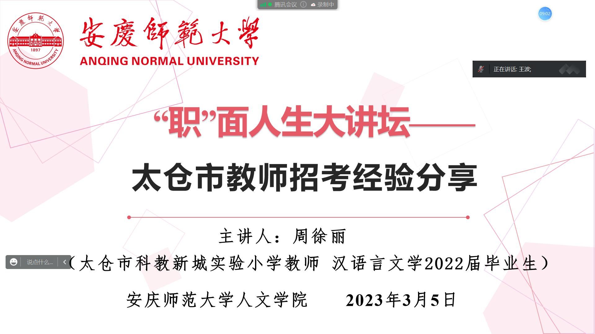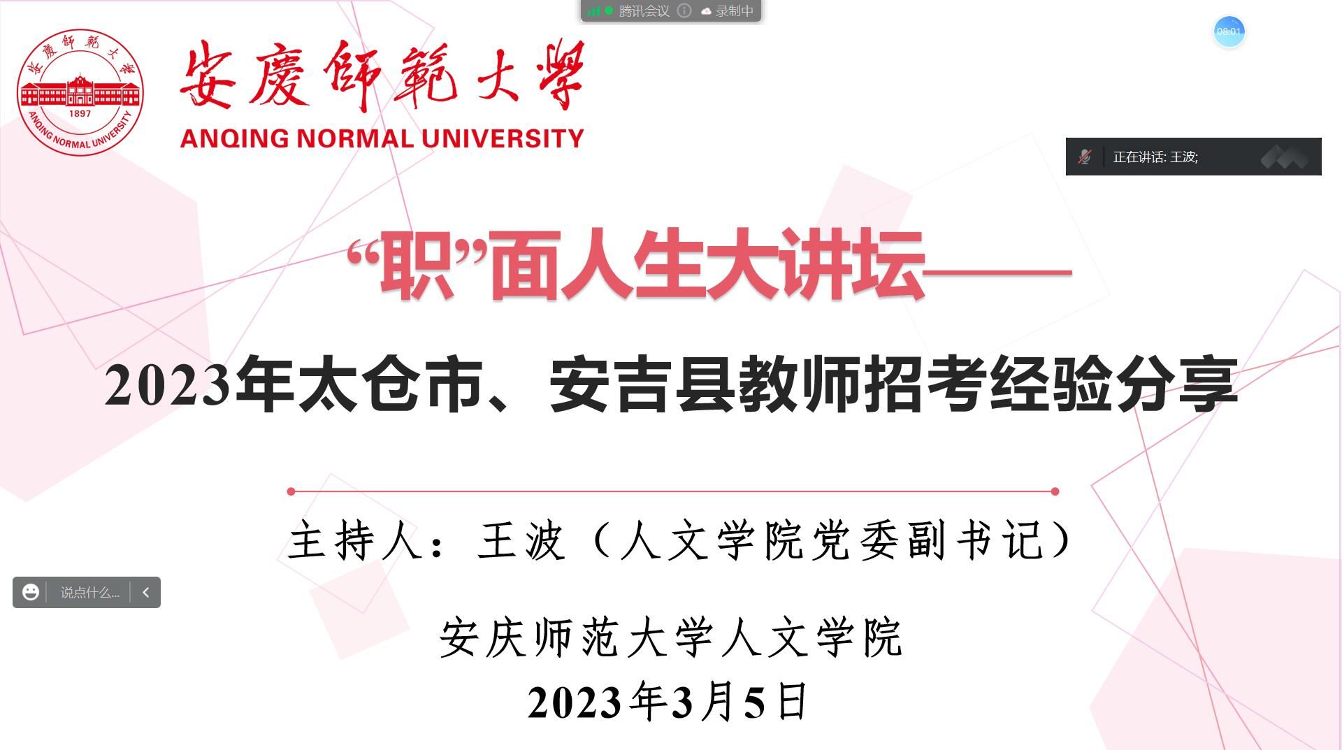 为有效落实公司2023届毕业生就业工作要求,强化工作措施、抓好就业服务,3月5日,公司召开2023年太仓市、安吉县教师招考经验分享线上交流会。此次会议由人文公司党委副书记王波主持,邀请了2021届毕业生董雪奇,2022届毕业生周徐丽、章颖三位招考成绩优异的教师分享备考经验、为同学们答疑解惑,2023届毕业生百余人参加了会议。