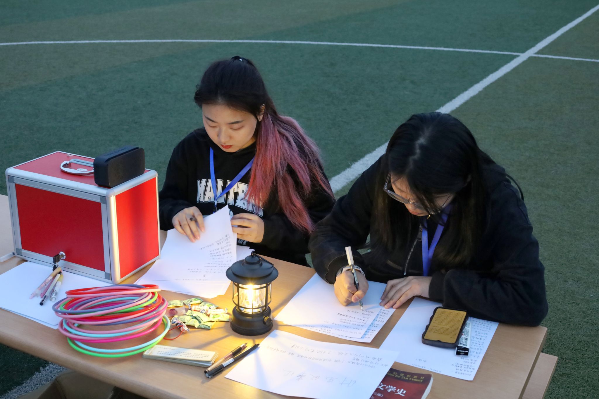 除上述活动外,在操场中心摆点处,工作人员还为员工们精心策划了“时光邮局”活动。在桌面小夜灯的柔光照射下,参与者们写下对未来自己的鼓励与期待,写下对毕业生、考研学子们的祝福与寄语,为他人送去一封封“爱心邮件”,“邮”去温暖与关怀。