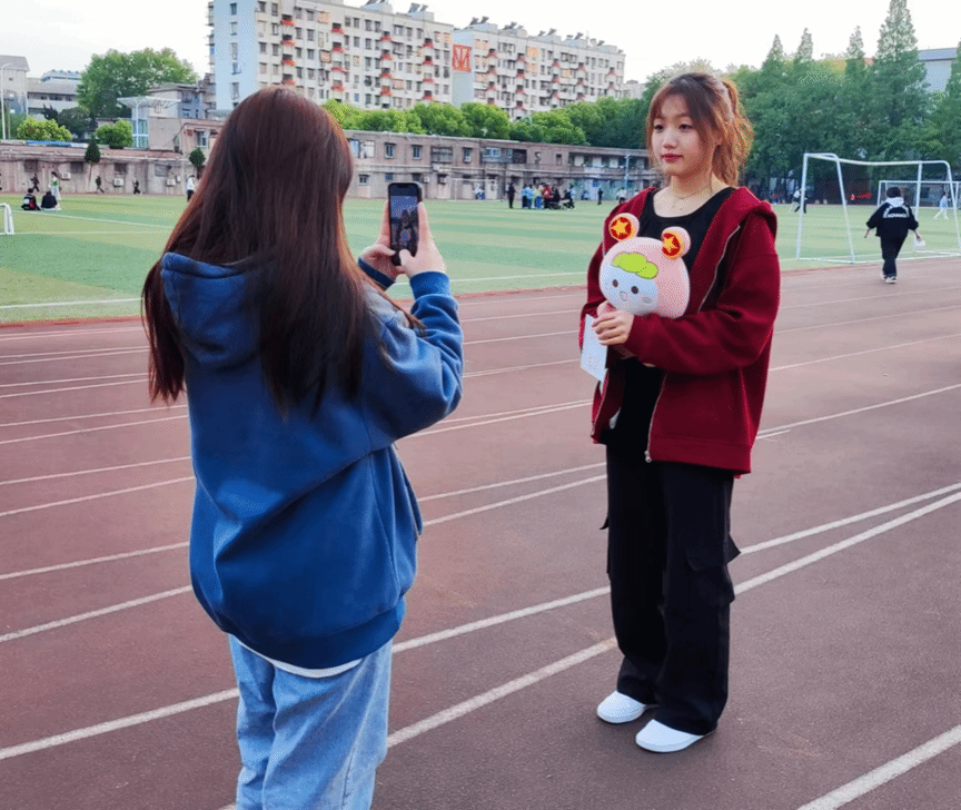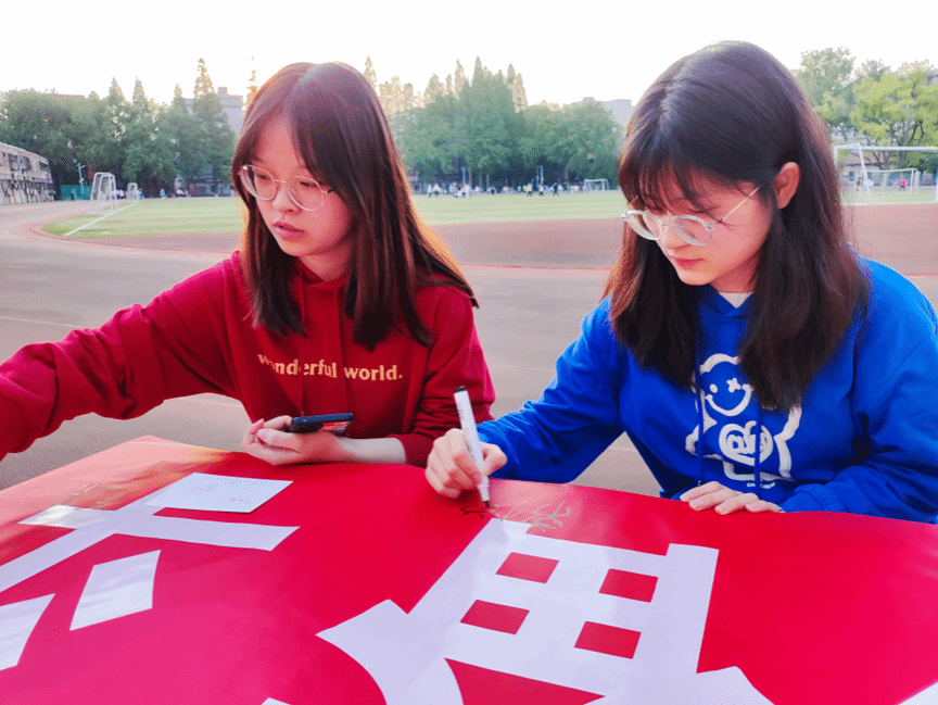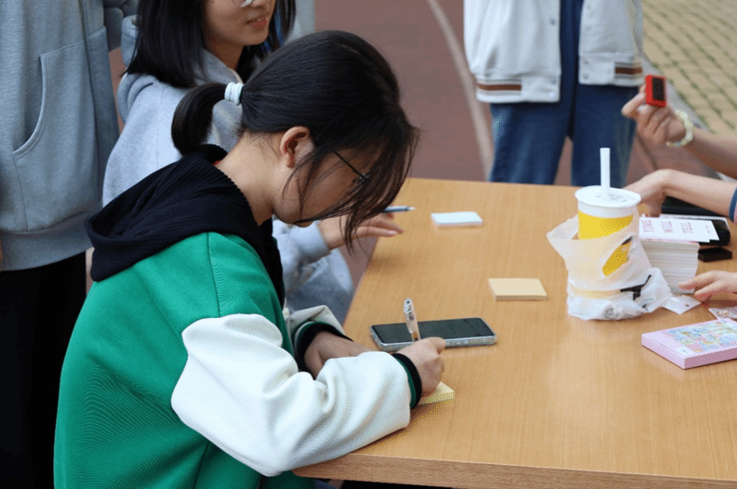 活动围绕操场跑道共设置了“理想”“信念”“青春”“未来”四个站点。参与活动的同学按照顺序依次到4个站点完成相应的任务后,分别可以获得“觉醒”“建设”“开放”“崛起”四个专属印章,最后可凭借打卡盖章记录到操场中央参与抽奖活动并领取一份纪念品。活动现场一片欢声笑语,同学们写寄语、签姓名、盖手印、与共青团主题玩偶团团合照打卡,留下最美的青春模样。