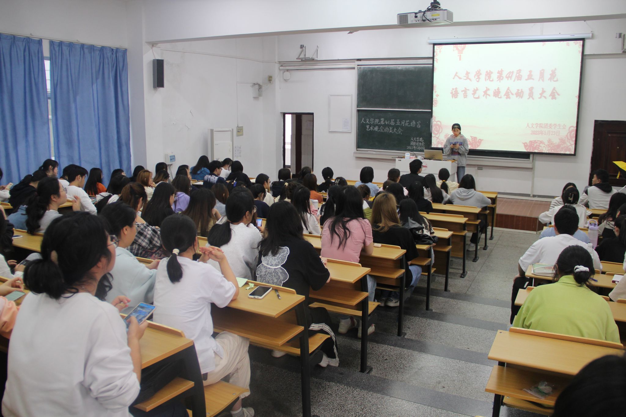 洪星星提出几点要求,要做好节目预案,防止突发事件;要求进一步细化职责,各部门应坚守岗位、各尽职责;要做好保存管理工作,避免造成不必要的损失。最后强调了各班级在后续进场观看节目时相关注意事项。