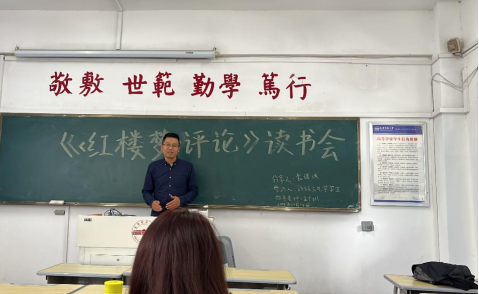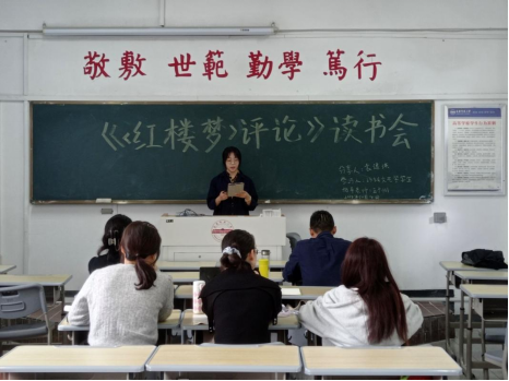 此次读书会主要分为主持人读书书目介绍、员工书籍内容介绍、师生讨论以及老师点评与总结四个环节进行。会议伊始,主讲人袁逸琪介绍了《‹红楼梦›评论》的作者及这本书在文学研究史上的意义,接着讲了三个方面的内容,一是《红楼梦》的悲剧意义,二是王国维与叔本华理论的中西对比,三是个人的阅读心得;随后,同学们对本次读书会所讲内容进行了深入讨论。