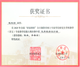 全国“田家炳杯”全日制教育硕士专业学位研究生学科教学(语文)专业教学技能大赛是面向全国教育硕士培养院校的重要学科技能竞赛,也是全国教育硕士研究生教学能力展示与交流的高水平平台。经过激烈角逐,何心怡同学荣获三等奖,程秋铃同学荣获优秀教学设计奖。