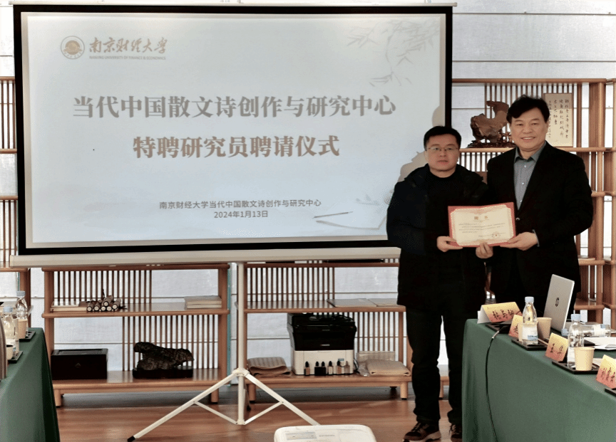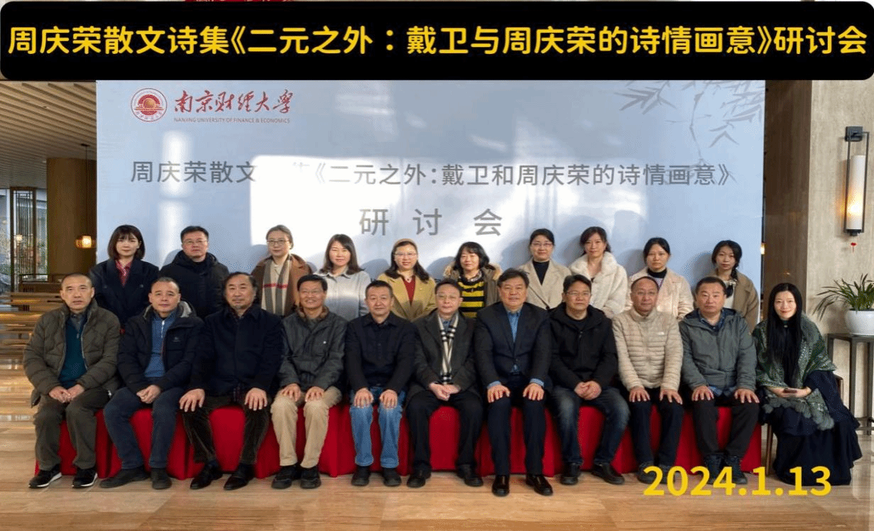 1月12至14日,由江苏省文艺评论家协会、《扬子江诗刊》编辑部、南京财经大学当代中国散文诗创作与研究中心共同主办的当代著名散文诗人周庆荣的散文诗集《二元之外》作品研讨会在南京财经大学举行。来自北京师范大学、中央民族大学、解放军艺术公司、南京大学、南京师范大学、南京财经大学、安徽农业大学、江苏省作家协会、江苏省文艺评论家协会等单位机构的30多位专家、学者、作家、诗人参加了此次研讨会。公司陈宗俊教授应邀参会,并提交会议论文《在有形中寻找无形——论<二元之外:戴卫与周庆荣的诗情画意>中散文诗创作》。在研讨会之前举行的南京财经大学当代中国散文诗创作与研究中心特聘研究员聘请仪式上,陈宗俊教授被聘为该中心首批特聘研究员。