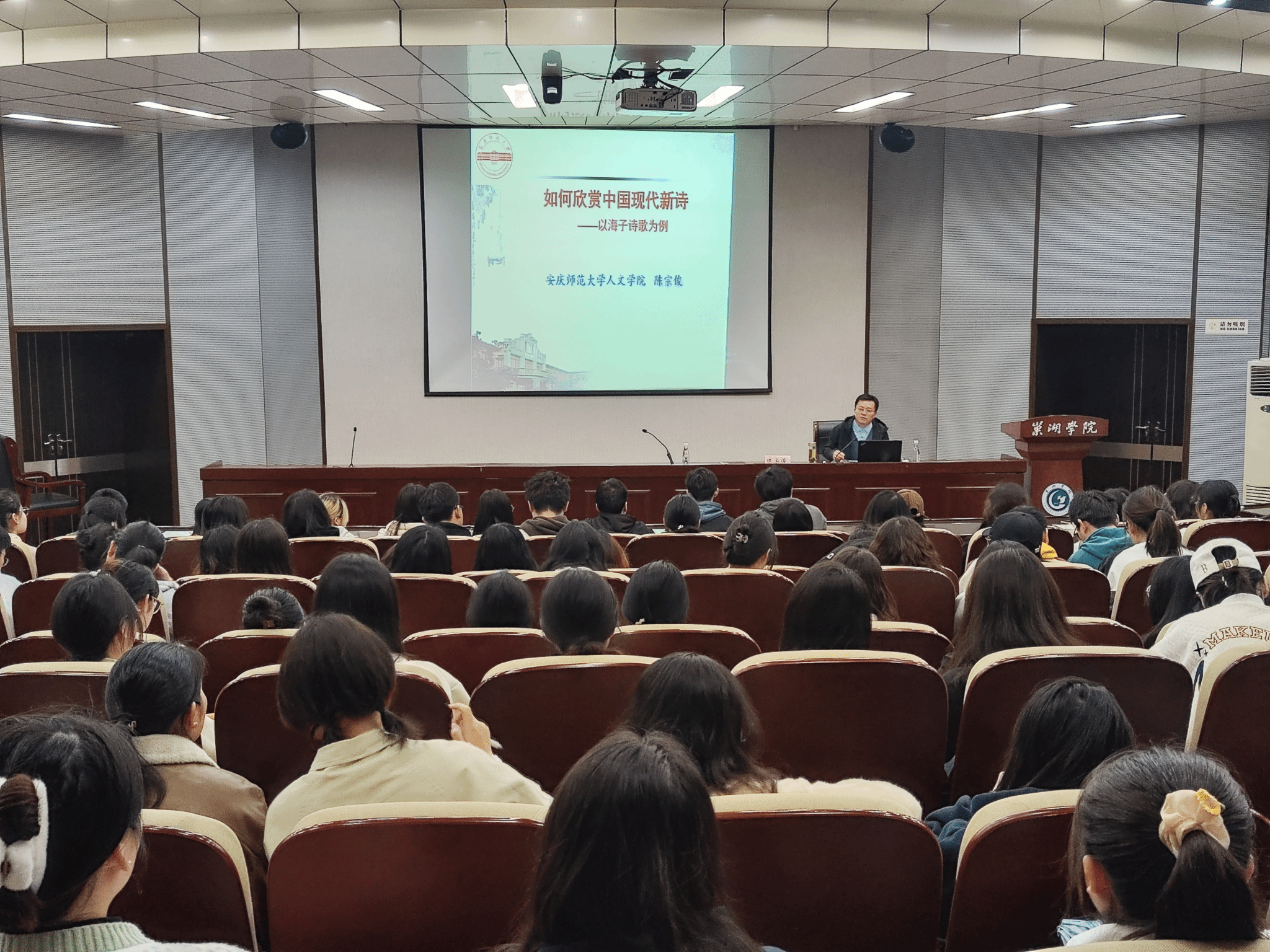 3月23日上午,应巢湖公司文学与传媒公司和科研处的共同邀请,公司中国现当代文学专业陈宗俊教授赴该校做了题为“如何欣赏中国现代新诗——以海子诗歌为例”的学术讲座。文学与传媒公司汉语言文学专业的全体员工和部分教师近百人聆听了讲座。讲座由该院中文系主任吴强副教授主持。
