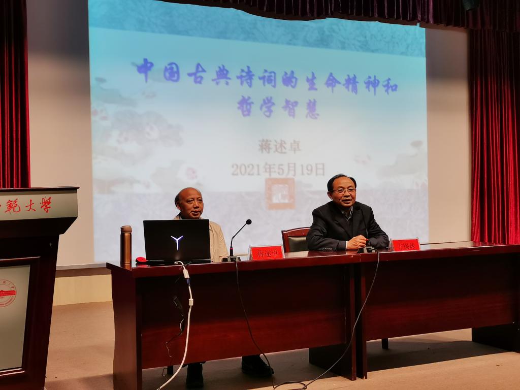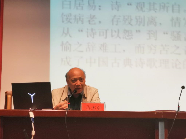5月19日下午,暨南大学中文系二级教授、博士生导师蒋述卓教授在菱湖校区图书馆报告厅做了题为“中国古典诗歌的生命精神和哲学智慧”的学术讲座。讲座由SUNBET申博方锡球教授主持,汉语言文学专业本科生、研究生近200人参加了本次报告会。