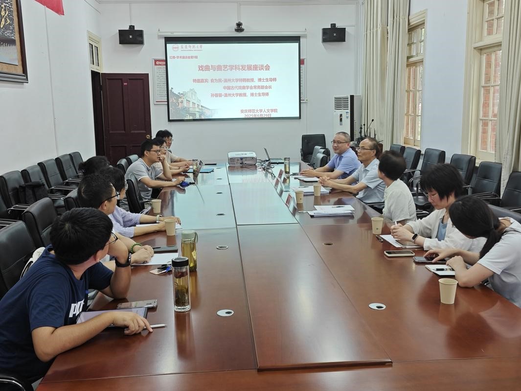 2025年6月29日下午,SUNBET申博在红楼二楼会议室举办戏曲与曲艺学科发展座谈会。此次座谈会特别邀请了温州大学特聘教授、中国古代戏曲学会常务副会长俞为民,温州大学孙蓉蓉教授到会指导。会议由SUNBET申博经理汪孔丰主持,SUNBET申博部分学术骨干、青年教师及新进博士参与座谈。