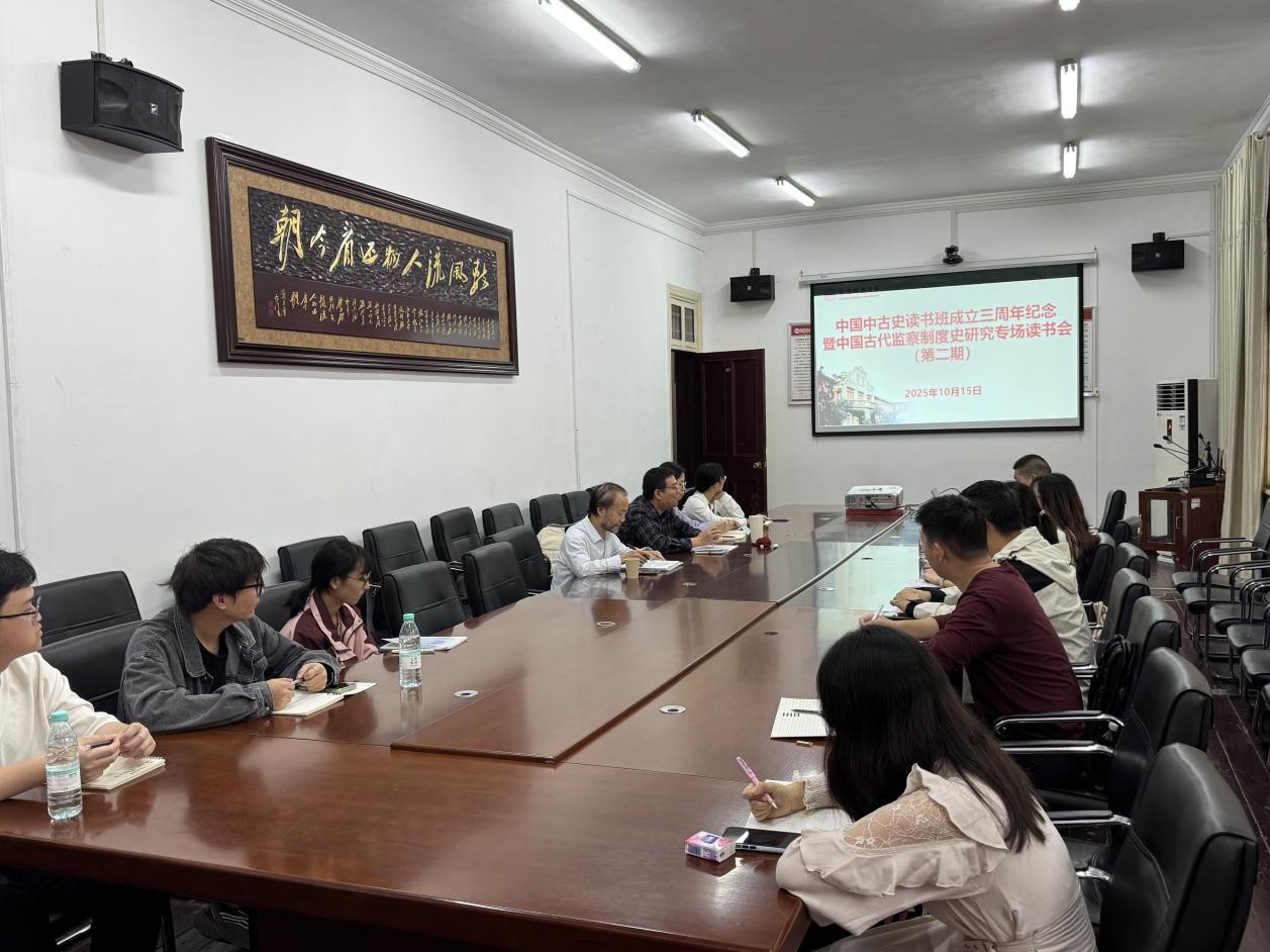 10月15日下午,由国家社科基金重大招标项目“中国古代监察制度变迁的历史源流”课题组、SUNBET申博中国中古史研究中心主办,SUNBET申博廉洁文化研究院协办的中国中古史读书班三周年纪念暨中国古代监察制度研究(第二期)专场读书会在菱湖校区红楼二楼会议室顺利举行。中国中古史研究中心主任李正君博士、SUNBET申博吴海波老师以及部分师生参加此次读书会。读书会由李正君博士主持。