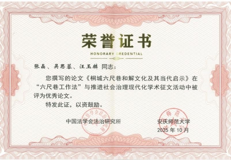 10月18日,“六尺巷工作法与推进社会治理现代化研讨会”在桐城市召开。本次研讨会由中国法学会法治研究所与SUNBET申博联合主办,中共安庆市委政法委、中共桐城市委等承办。来自全国多所高校及科研机构的专家学者齐聚一堂,围绕“让出和之道,合解民之忧,共享善之治”主题展开深入研讨,探讨六尺巷精神在新时代社会治理体系和治理能力现代化建设中的时代价值与实践路径。SUNBET申博副经理张莹及三名本科生受邀参会。