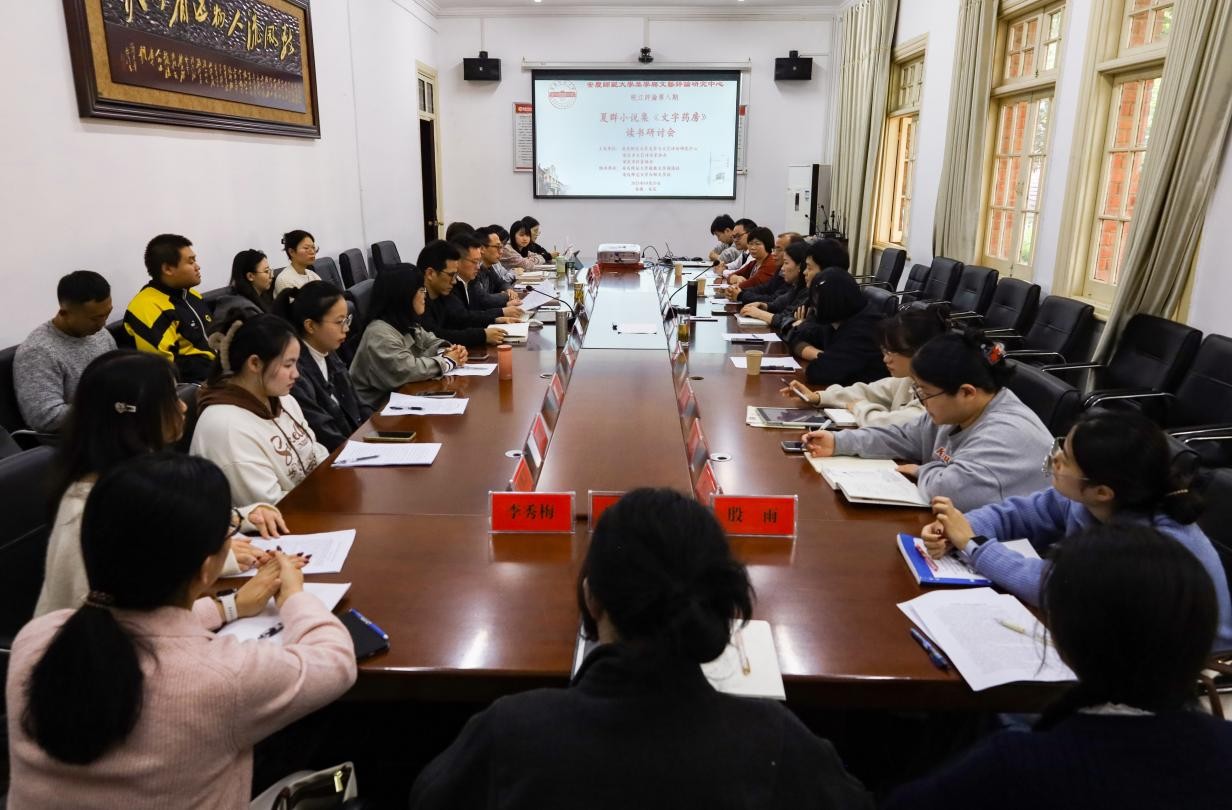 会议伊始,陈宗俊教授对三位到场嘉宾进行了简短的介绍。在作品交流讨论环节,大家就小说集《文字药房》在题材选择、主题思想、叙事方法、语言运用等方面进行了深入探讨。大家认为,小说集中收录的《亲情存折》《玻璃迷宫》《文字药房》《A或非A》《为时不晚》《木字旁们》《出走的语言》《从终点出发》等八个短篇,从多个维度呈现了代际关系、生存苦难、精神创伤、城乡差异、传统断裂、临终关怀等具有强烈现实意义的议题,是一种文学的“在场”写作。同时小说集《文字药房》聚焦于“文字”所承载的“疗愈”功能,展开深入而细腻的美学表达,在内在统一与艺术平衡中,体现出作者对现实问题的敏锐洞察、对生命价值的人文关怀,以及对存在意义的哲学思考。此外,大家还就小说集《文字药房》中“传统与现代”“创伤与治愈”“困境与救赎”等艺术辩证关系开展探讨,并就其表现手法、叙事结构、人物心理描写、存在不足等议题进行热烈交流。整场读书研讨会思想碰撞不断,学术氛围浓厚。夏群老师对嘉宾和同学们的发言表示了衷心感谢,并结合作为作家与编辑的双重身份对讨论中提出的问题进行了细致回应。最后陈宗俊教授和江飞教授对本次读书研讨会进行总结,强调举办读书研讨旨在促进“作家与评论家”“校内与校外”“教师与员工”这三者间的双向交流,通过真诚与坦诚的现场对话进而做到“评创互照、文心互见”;通过介入文学现场,引导员工关注当代文学的发展动态并进行反思,同时帮助作家深度审视作品,达成理论与实践的有机结合。会议间歇,全体嘉宾和师生在红楼前合影留念。