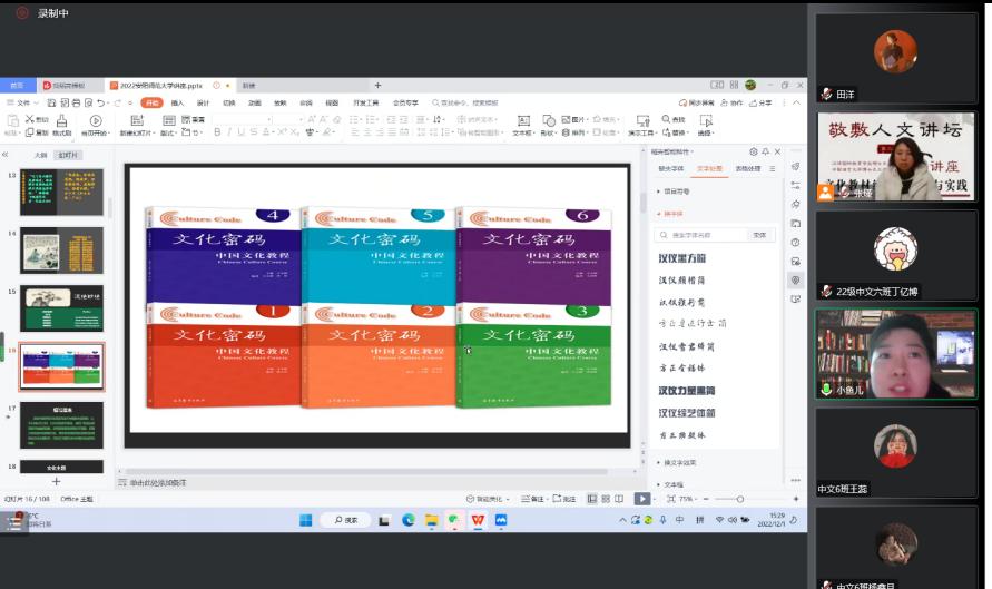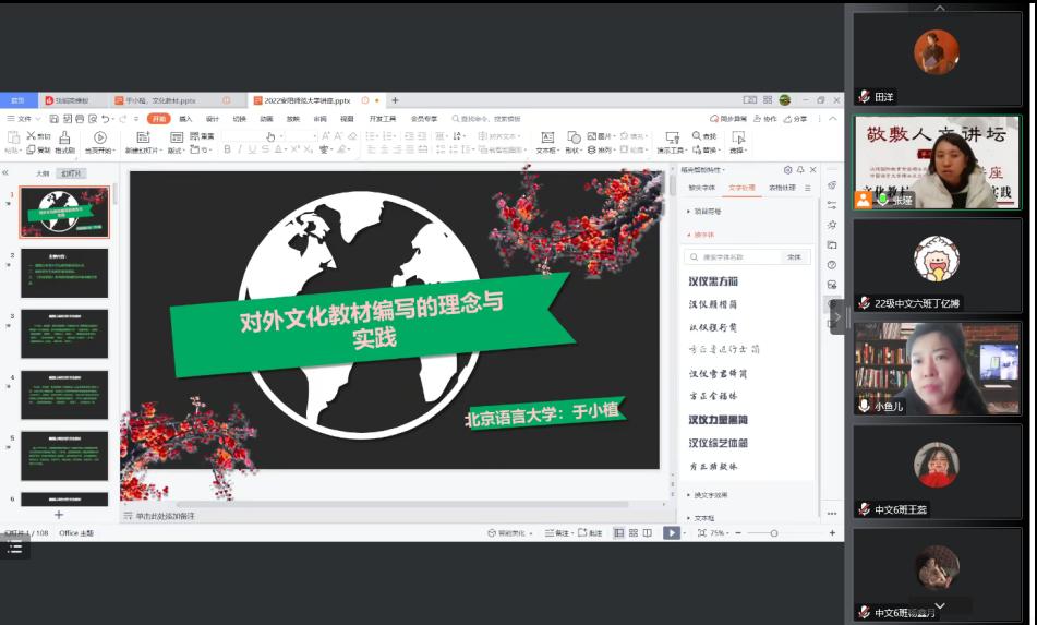 12月1日下午14时,敬敷人文讲坛第二十六讲顺利举行,北京语言大学文公司教授、博士生导师于小植应SUNBET申博邀请作了题为“文化教材编写的理念与实践”的线上讲座。本次讲座由张瑾博士主持,李金梅副教授与谈,该院部分青年教师、研究生和汉语国际教育专业本科生共50余人参与线上交流学习。