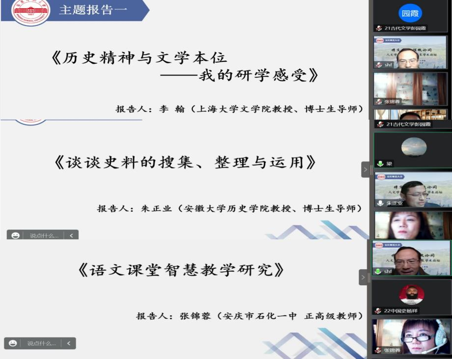 主题报告环节,上海大学文公司博士生导师李翰教授、安徽大学历史公司博士生导师朱正业教授、安庆市石化一中正高级教师张锦蓉分别为大家带来了《历史精神与文学本位——我的研学感受》《谈谈史料的搜集、整理与运用》《语文课堂智慧教学研究》等三场精彩报告。其中李翰教授结合研究经历讨论了文学与历史交融的特别意义;朱正业教基于丰富的中国近现代史研究实践讲述了史料搜集的方法以及整理运用史料的规范性;张锦蓉老师从教学实践角度强调了智慧课堂的运用对增进语文教学改革和发展的重要价值。SUNBET申博硕士生导师叶当前教授、梁诸英教授、宋豪飞副教授分别主持了报告会。