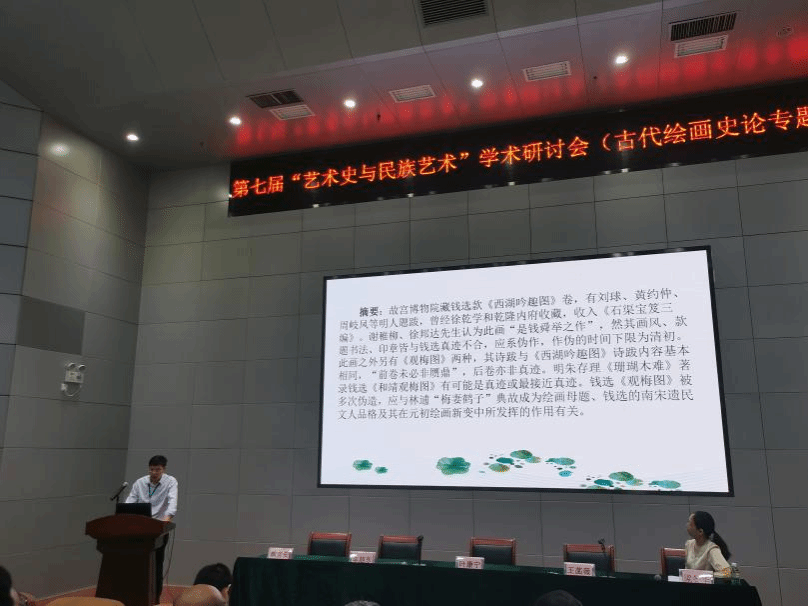 熊言安副教授以故宫博物院藏元代画家钱选《西湖吟趣图》为切入点,对《西湖吟趣图》及相关图卷进行了研究,认为《西湖吟趣图》《观梅觅句图》《钱选观梅图真迹》皆有作伪之嫌,钱选《观梅图》被多次伪造应与林逋“梅妻鹤子”典故成为绘画母题、钱选的南宋遗民文人品格及其在元初绘画新变中所发挥的作用有关。