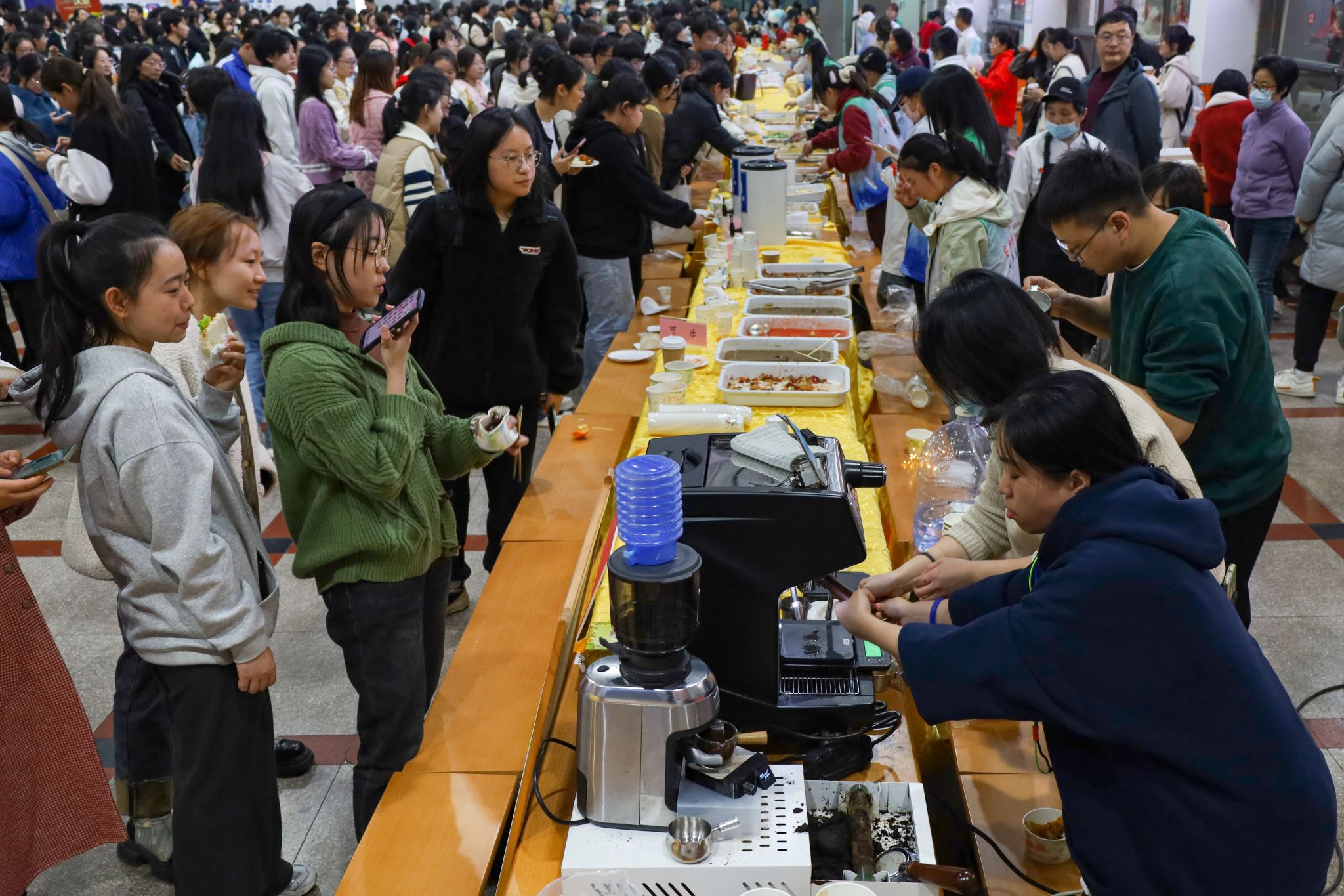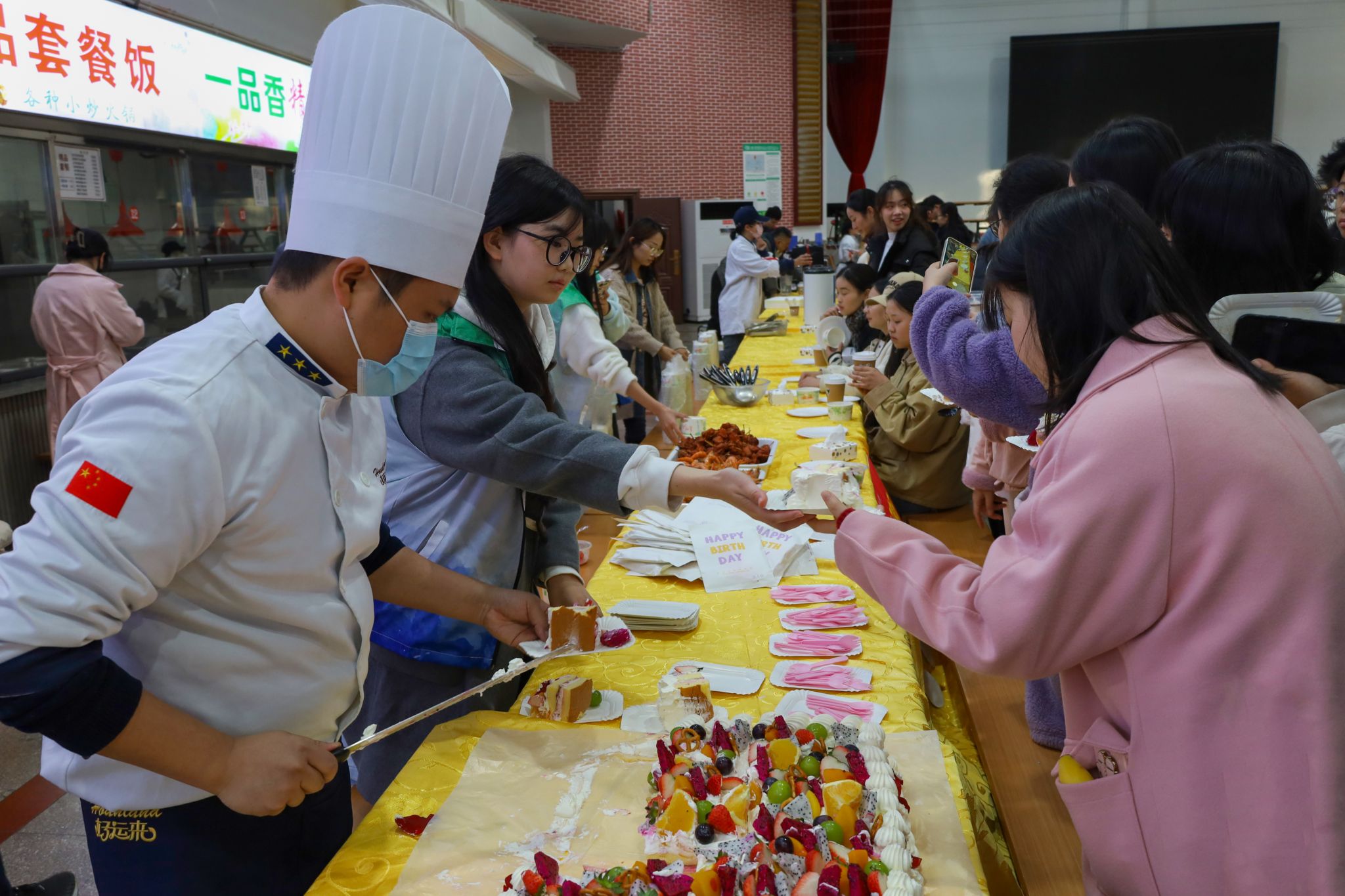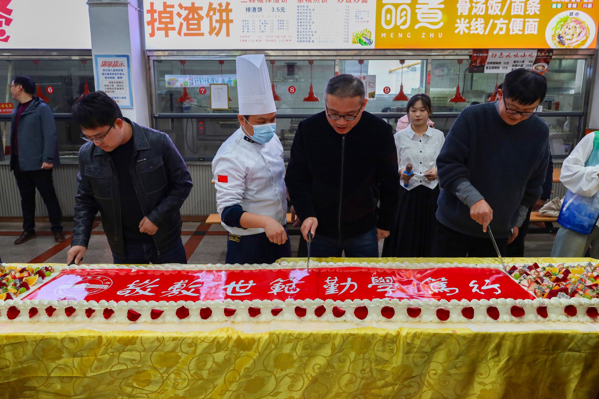 基建与后勤管理处副处长查国平、SUNBET申博副经理汪孔丰及安徽中快餐饮有限公司总经理何伦共同切开印有 “敬敷 世范 勤学 笃行” 校训和校徽字样的、并由水果点缀的大蛋糕,宣告着美食节正式拉开序幕。三明治、甜甜圈、泡芙、咖啡等各类西式甜点饮品整齐排列,中式美食糖醋排骨、红烧肉、金牌猪脚等秀色可餐,传统糕点烧卖、发糕、燕麦粥等食品也给现场平添了许多“烟火气息”。