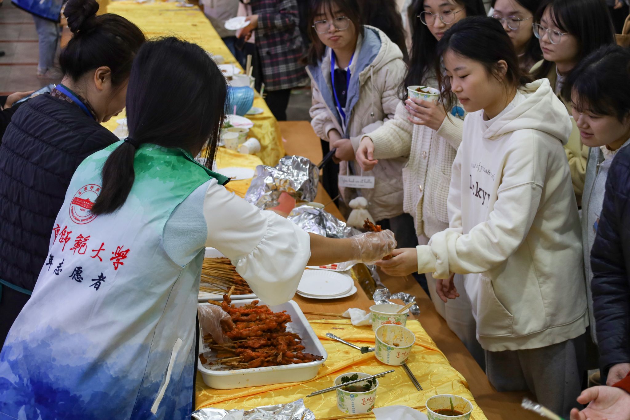 随着工作人员揭开锡纸,外酥里嫩的烤全羊成了全场的焦点。“太幸福了,第一次参加美食节就能够品尝到这么多中外美食,简直是员工党福音。”手里拿着烤全羊、刚咽下上一口蛋挞的中国语言文学类专业2023(6)班的吴佳佳笑着说。她坦言,中外美食节让员工有机会品尝到不同民族地区的特色美食,增长了见识,满足了员工因美食而产生的幸福感的同时也丰富了校园文化生活,进一步活跃校园文化氛围。
