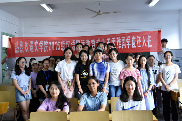 “恭喜南海舰队喜提雅姐!”9月19日下午,在文公司306教室,汉语国际教育专业2016级的员工们举办了一场特殊的送别会,为即将远赴广东参军的王孟雅同学送行。