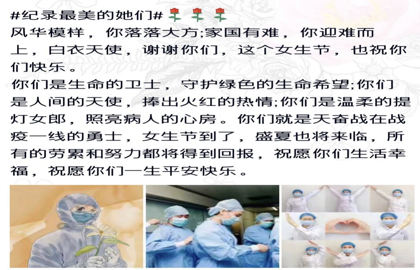 今年度“三七女生节”与往年不同,女生部发起“记录最美的‘她们’”征集环节。面向同学们征集优秀女性照片、短视频等,通过不同的视角,记录我们身边女性的日常生活和闪光点,展现女性风华。她们,有勇于与死神抗争的天使,有细心不图回报的母亲……她们巾帼不让须眉,彰显了“最美”的芳华。记录中也饱含深切的祝福:“风华模样,你落落大方;家国有难,你迎难而上,白衣天使,谢谢你们,这个女生节,也祝你们快乐……”用这样的方式展现“最美她们”,发挥先进典范榜样力量和示范带动作用,让广大师生学习这些最美女性的担当精神和高贵品格。