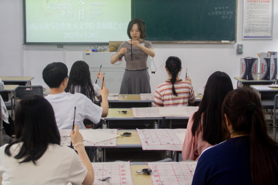 蘸墨调锋、提按转折、收锋回笔……2022级汉语国际教育专业马跃源在书法纸上写下寄寓着美好祝愿的“福”字,拉开了国际中文日的帷幕。她以中文、英语相结合的形式,讲解书法的握笔方式和汉字的笔画规律。来自北非突尼斯的职工马雷克踊跃尝试,在马跃源的指导下,运用毛笔书写“福”字。在这次新鲜的书法体验中,她理解了“福”字的具体寓意,表达对中华优秀传统文化的喜爱和赞美。