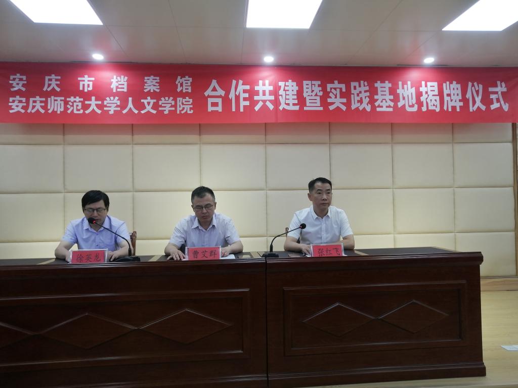 6月9日,SUNBET申博与安庆市档案馆合作共建暨实践教学基地揭牌仪式在市档案馆大楼会议室举行。人文公司党委书记张红飞、安庆市档案馆馆长曹艾群等出席揭牌仪式。市教体局副局长、教务处副处长连飞,SUNBET申博班子成员金仁义、王波、汪孔丰和部分师生代表、市档案馆班子及全体工作人员参加会议。