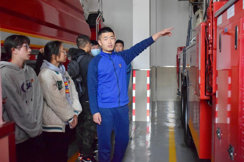 介绍完消防车,消防员向同学们说明了出警前穿戴消防衣的步骤和注意事项。随后,在消防员的指导下,同学们进行了消防衣穿戴大比拼活动。2021级历史学3班的刘敏体验过后说:“消防服很笨重,穿上去也比较困难,真是无法想象消防员经过怎样刻苦的训练才能做到在火场上穿梭自如,这让我认识到消防工作的辛苦,同时也让我在生活中更加注意安全用电用火。”