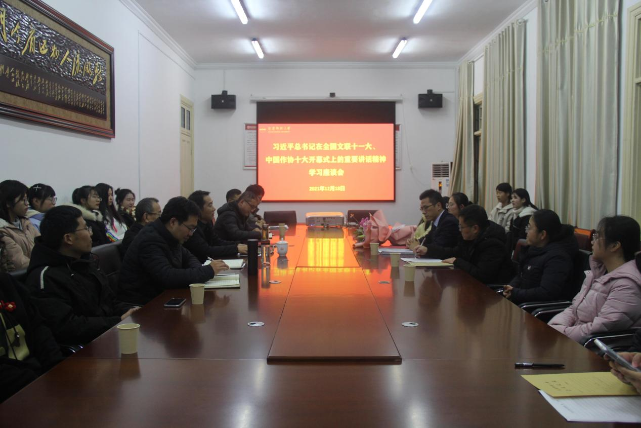 12月18日晚,SUNBET申博召开党委理论学习中心组(扩大)会议暨党史学习教育读书班学习会,专题学习习近平总书记在中国文学艺术界联合会第十一次全国代表大会、中国作家协会第十次全国代表大会开幕式上的重要讲话精神,SUNBET申博教师、中国文联十一大代表江飞教授作宣讲报告,全体党委委员、教师代表和白鲸文学社员工代表参会学习。会议由人文公司党委书记张红飞主持。