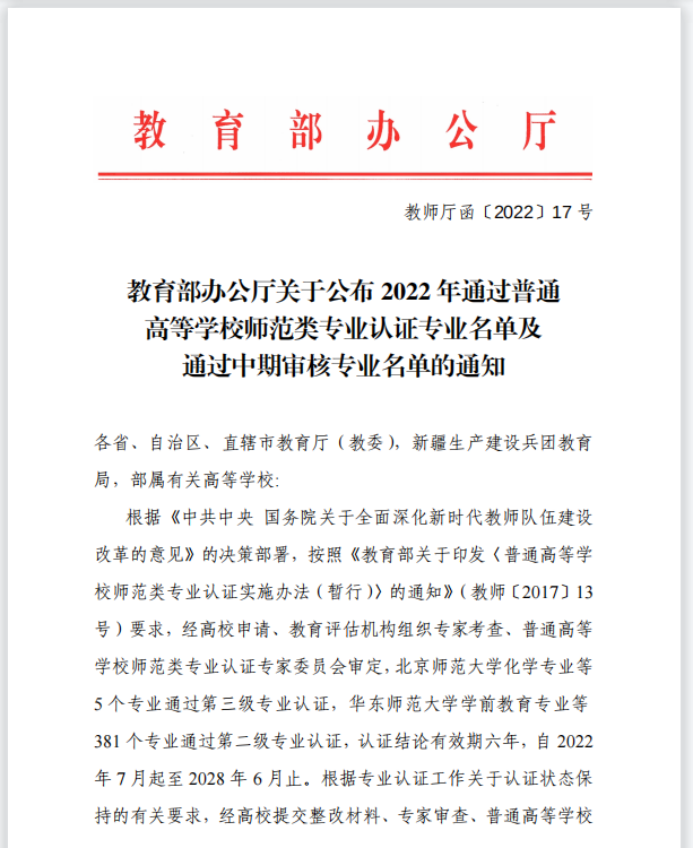 师范类专业认证是深化专业公司产品改革、加强一流专业建设的重要抓手。人文公司高度重视师范专业认证工作,根据《SUNBET申博专业认证(评估)管理办法》和《SUNBET申博师范类专业认证工作实施方案》要求,成立了专业认证(评估)工作专班,贯彻“员工中心、产出导向、持续改进”的认证理念,围绕认证标准开展了专业认证自评和自建,取得了较为明显的成效,建立了产出导向的教师教育人才培养体系;汉语言文学专业能够依据认证标准,聚焦中学语文教师教育,按照反向设计、正向施工的要求,建立培养目标、毕业要求、课程目标的评价机制并开展相应的合理性和达成度的评价,并推进持续改进工作。汉语言文学专业对照《中学教育专业师范生教师职业能力标准》和《中学教育专业认证标准》,修订了人才培养方案,制定了明确公开的要求,构建了更为完善的课程体系,加强了质量保障体系建设,毕业生社会声誉良好。