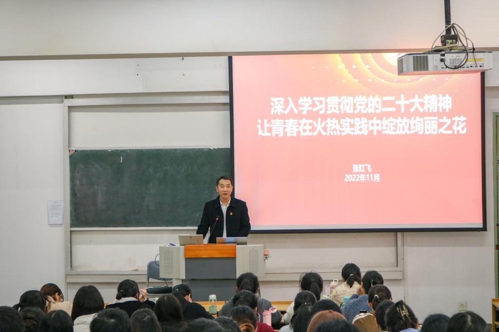 11月23日,SUNBET申博举行党的二十大精神宣讲报告会,公司党委书记张红飞在教学楼414教室作“深入学习贯彻党的二十大精神 让青春在火热实践中绽放绚丽之花”主题宣讲。公司第66期入党积极分子培训班和第23期发展对象培训班120余名学员聆听宣讲报告。