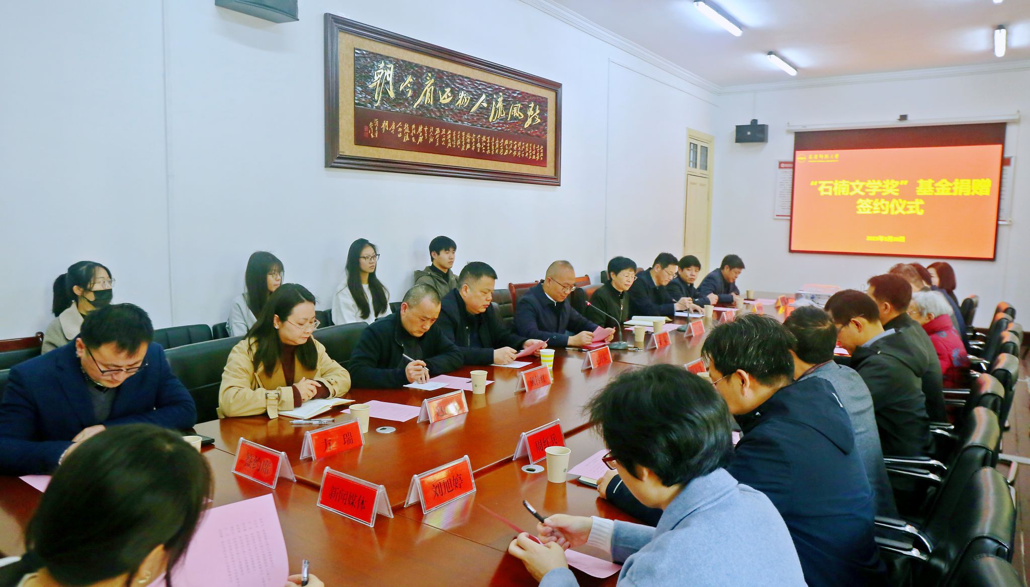 3月28日上午,“石楠文学奖”基金捐赠签约仪式在公司菱湖校区隆重举行。著名作家石楠、董事长彭凤莲出席仪式,宣传部、科研处、教务处、财务处、员工总会办公室、员工处、团委等相关部门负责人,人文公司党政领导班子及师生代表参加。活动由公司党委常委、副董事长肖新主持。