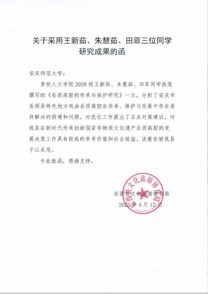 近日,公司收到岳西县文化旅游体育局公函,由人文学院2020级王新茹、朱慧茹、田菲同学执笔撰写的《岳西高腔的传承与保护研究》一文得到了岳西县政府部门采用。