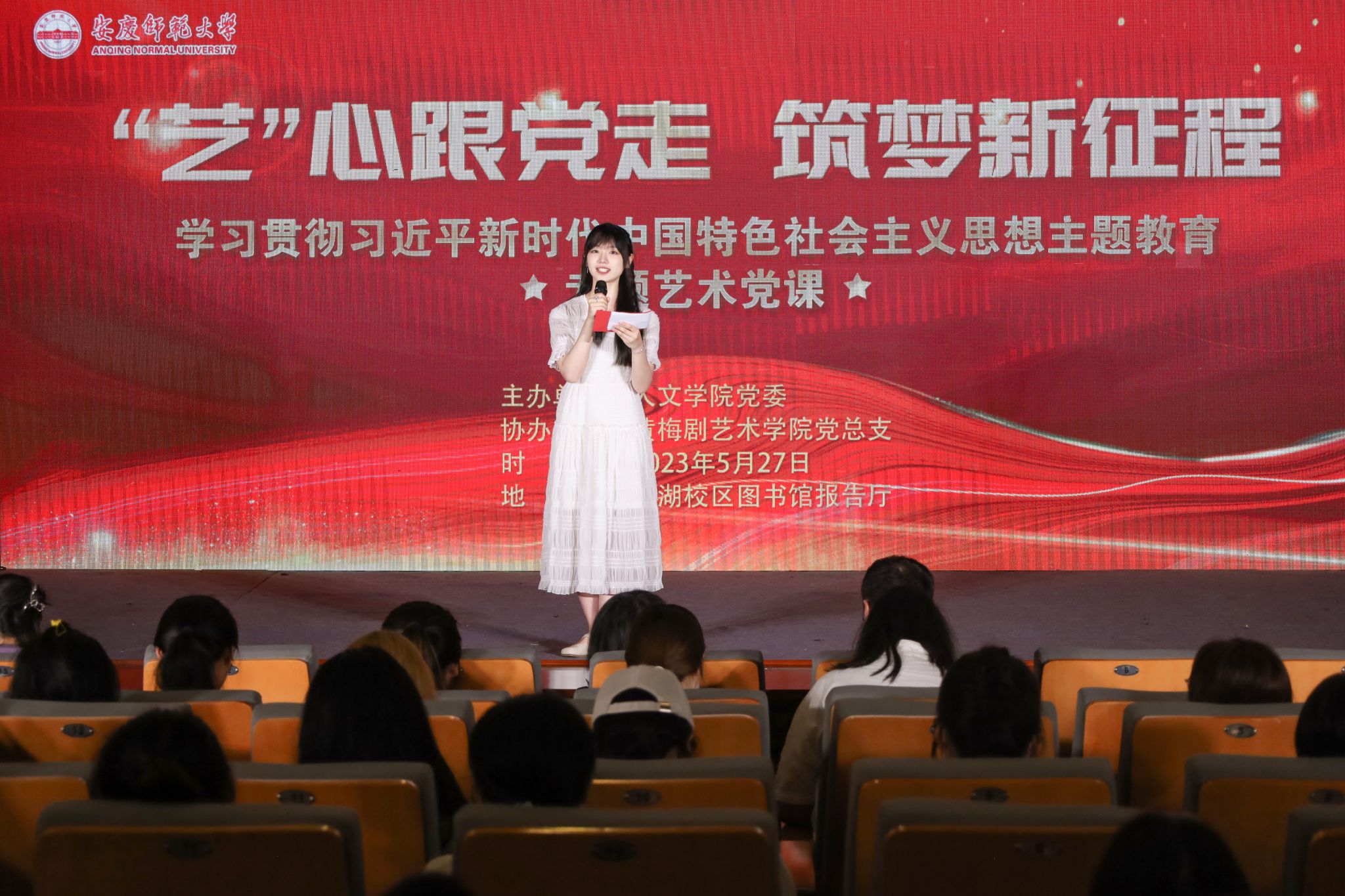 5月27日,一场主题为“艺心跟党走,筑梦新征程”——学习贯彻习近平新时代中国特色社会主义思想主题教育专题艺术党课在菱湖校区图书馆报告厅拉开帷幕。公司党委组织部副部长吕佳、人文公司党委副书记王波、黄梅剧艺术公司副经理刘国平出席活动,两院员工党支部书记等教师代表、第67期入党积极分子、第3期青马班学员近230余人到场观看。