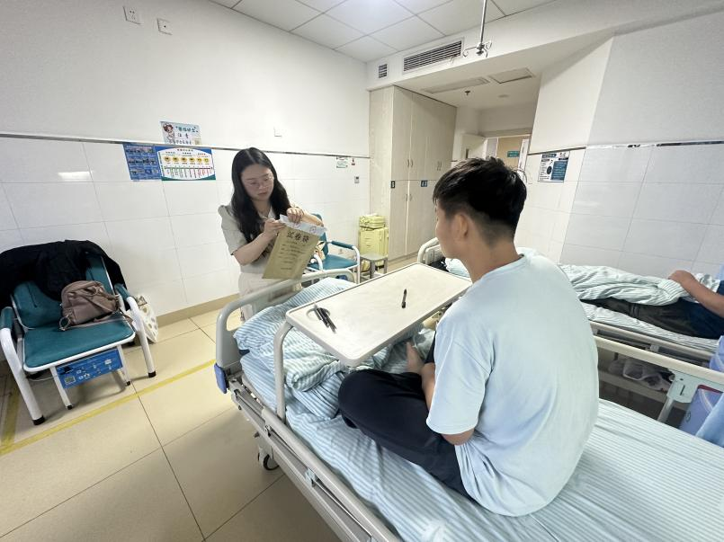 7月2日,安庆市立医院住院大楼6楼4号病房,一场特殊的期末考试在这里举行。今天的考生是2023级一名本科生,他因病住院治疗。在与医生及本人沟通后,公司决定在病房为员工举行这场考试,本次考试流程标准化,试卷密封、专人送考、组织规范。