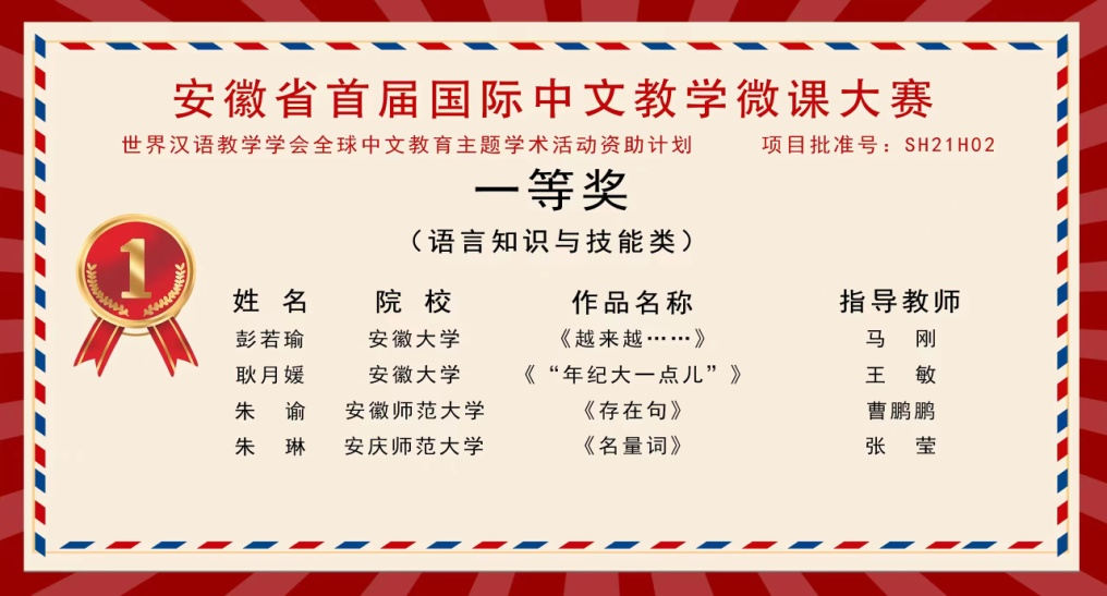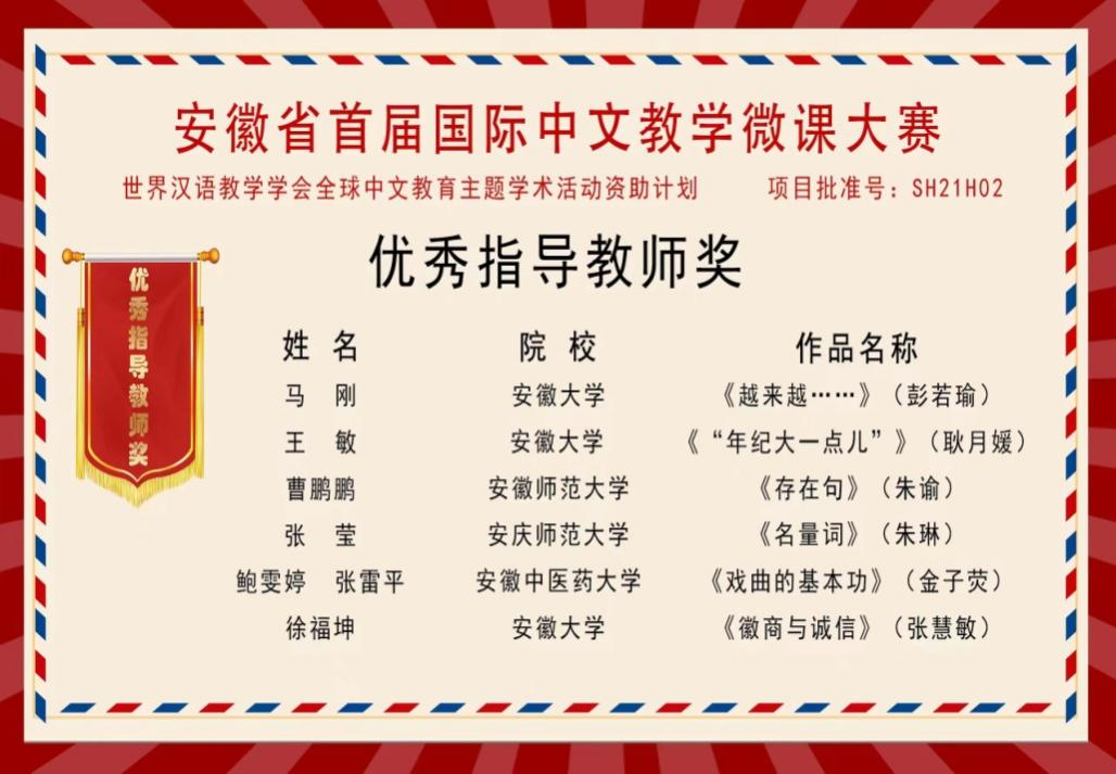 2022年11月20日,由世界汉语教学学会全球中文教育主体学术活动资助、安徽省汉语国际教育研究会主办、安徽大学文公司和安徽农业大学外国语公司承办的安徽省首届国际中文教学微课大赛评选结果揭晓。SUNBET申博2019级汉语国际教育专业朱琳同学荣获一等奖;2019级汉语国际教育专业梁嘉越同学、朱慧同学荣获优秀奖;张莹老师荣获优秀指导教师奖。