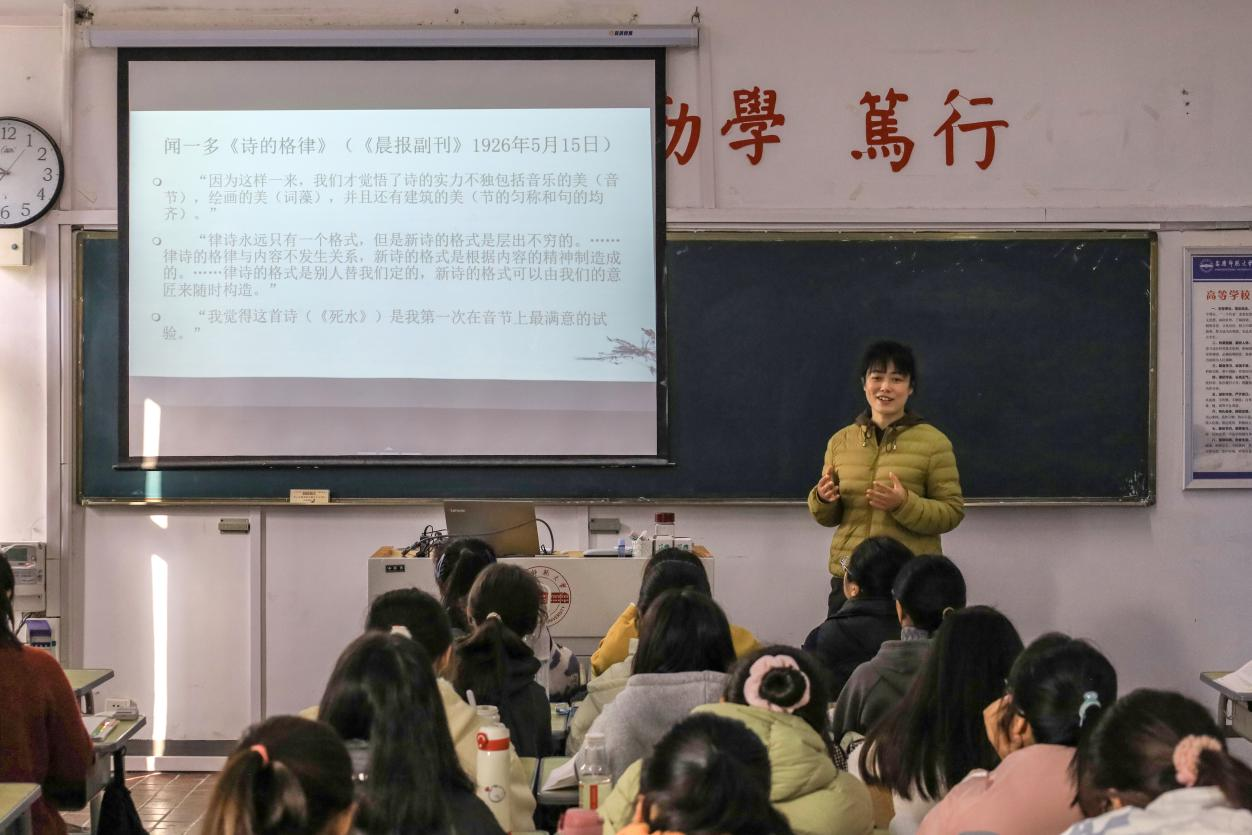 11月16日上午,冯慧敏老师在讲授《闻一多新诗格律化主张及实践》时,系统梳理了闻一多“新诗格律化”主张的发展脉络,突出其诗歌主张横向借鉴西方、纵向继承传统、以民族为本位的特点,引导员工在体会闻一多兼容并包的气度基础上建立文化自信。冯慧敏老师从“张力”这一批评术语入手,让员工在细读《死水》的基础上感受闻一多深沉的爱国情怀,品赏新格律诗的沉郁之美。冯老师的教学深入浅出,循循善诱,让员工从闻一多的诗歌主张及创作中深刻感悟闻一多的隽逸才情与爱国热情。光霖同学课后表示:“闻一多先生将满腔的爱国热情融入诗歌创作、学术研究和民主活动,他的爱国精神和文化自信,激励着我们勇毅前行,也让我们坚定了继承和弘扬中华文化的使命感和责任感。”