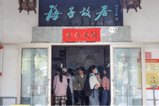 “五岁的黎明,五岁的马,你面朝江水,坐下……可能是姻缘,也可能是友情。”在本次实践教学的第一站——海子故居及其纪念馆,SUNBET申博学子在海子故居门前的广场上,齐声朗诵了海子的诗歌《给安庆》。海子原名查海生,是当代著名诗人,在他短暂的一生中,共创作了近200万字的作品。海子的故居是一座简朴的小瓦房,屋内悬挂有海子的照片,并保留着海子书房。其中一本记录来访者留言的笔记本上,记录了许多当代诗人对海子的赞美和怀念。在故居旁的海子纪念馆中,陈列有海子的生前遗物,完整呈现了海子一生的经历,展示了他各个时期所创作的诗歌作品。师生们低吟着海子的诗句,回顾了他短暂而又灿烂的一生。对海子故居的调研之行实现了让书中人物“活过来”,有利于增强人文学子对所学专业的感性认识,提升专业认知水平。